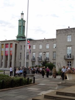 The band led members of the Walthamstow Royal British Legion and Standard Bearers around the fountain at Walthamstow Town Hall to the Assembly Hall, outside which a large crowd of people gathered to attend the commemoration evening. The Union Jack was raised and guests headed inside the hall, led by the band.